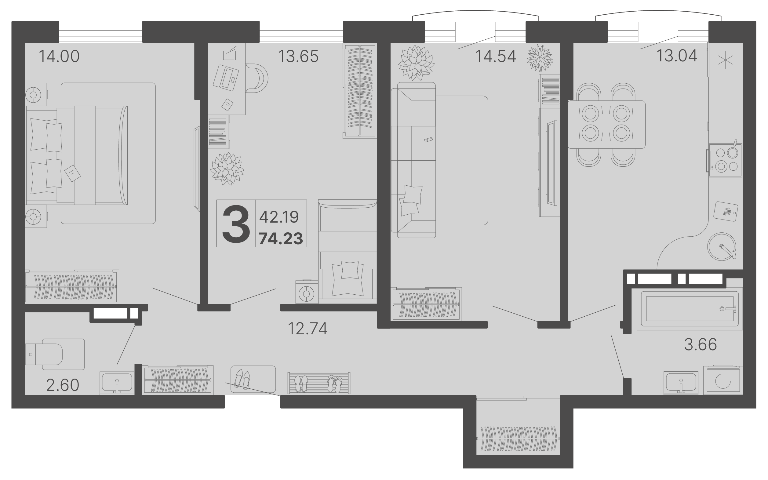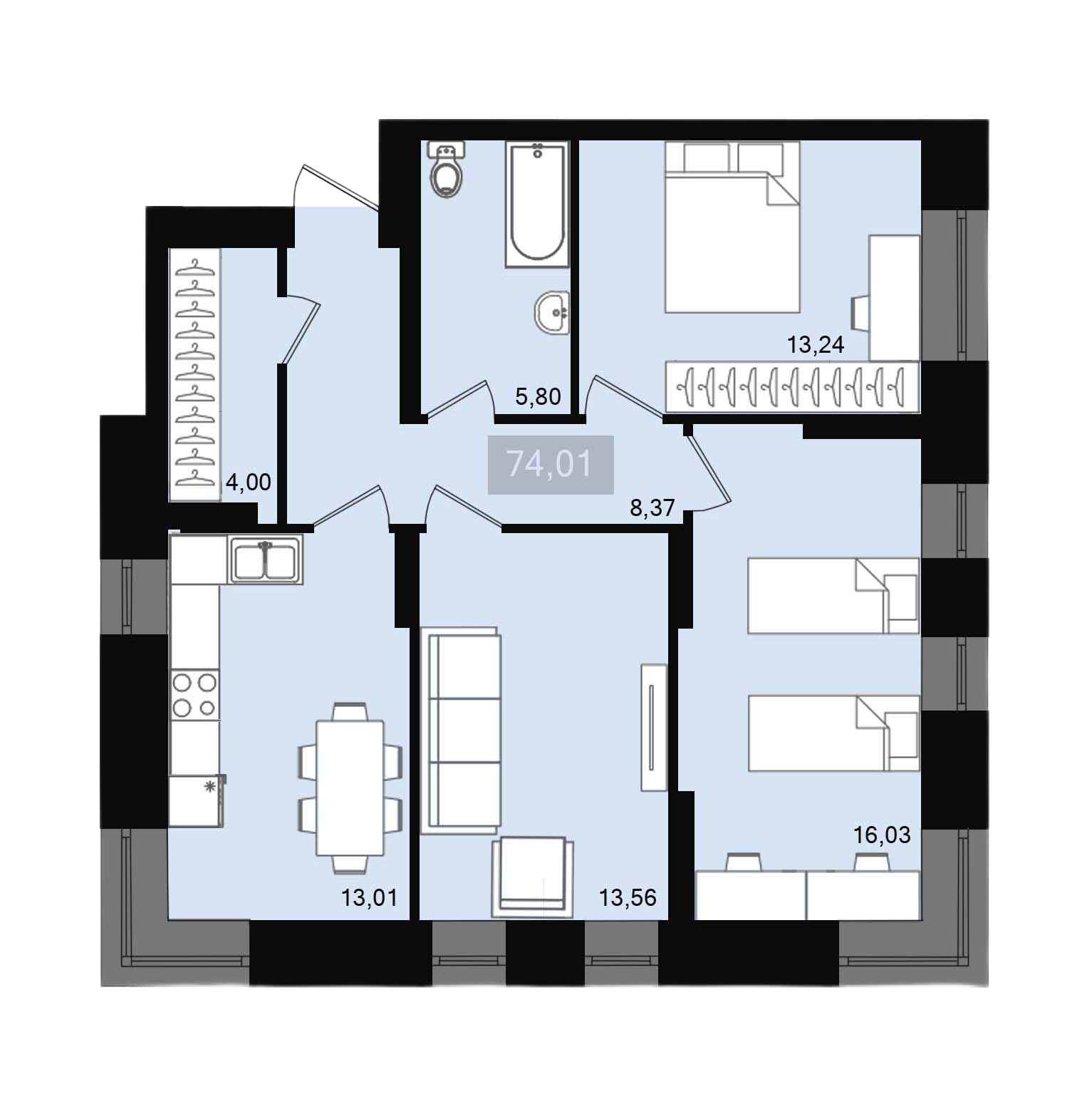 3-комнатная квартира, 74,01 м2