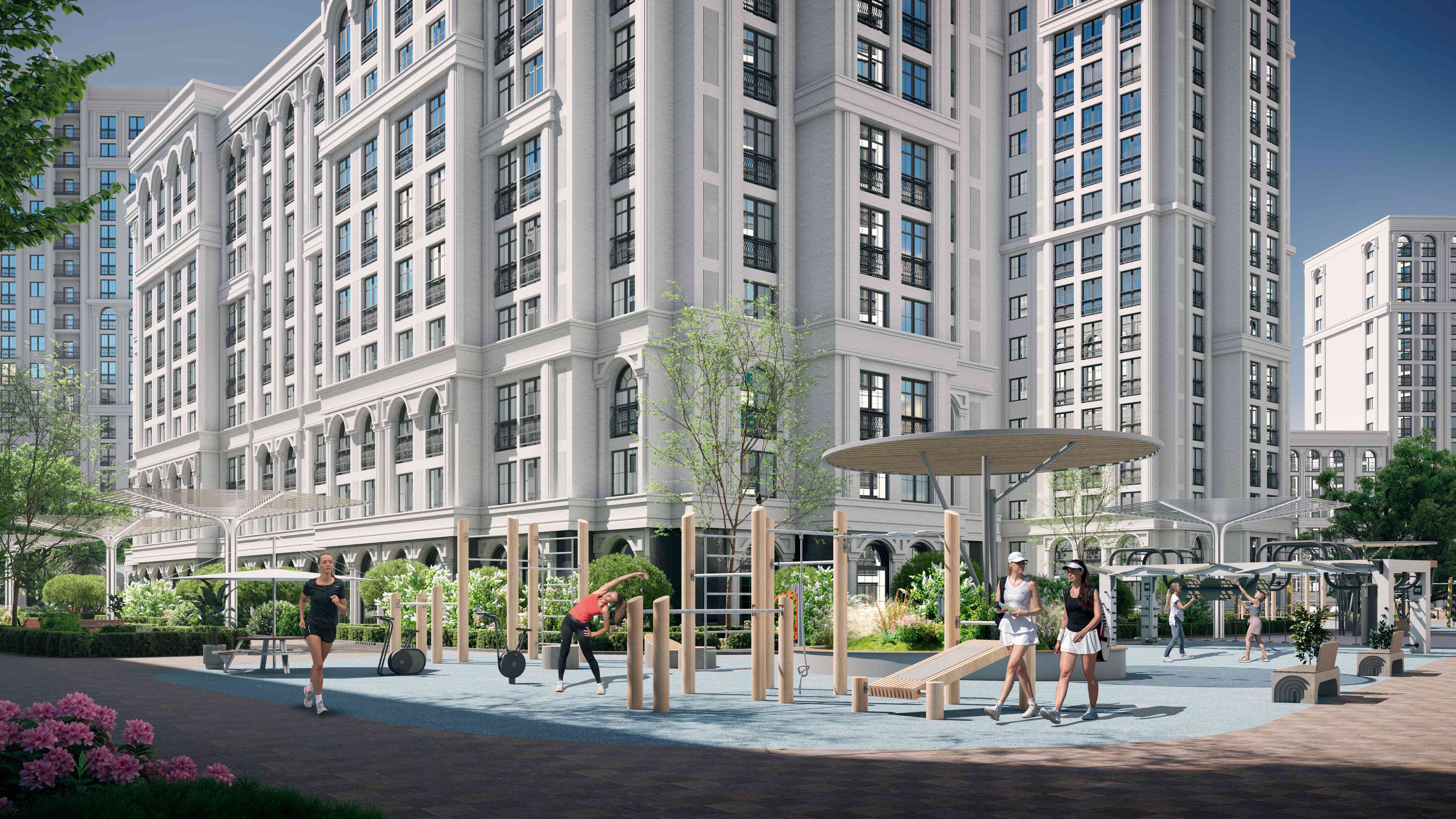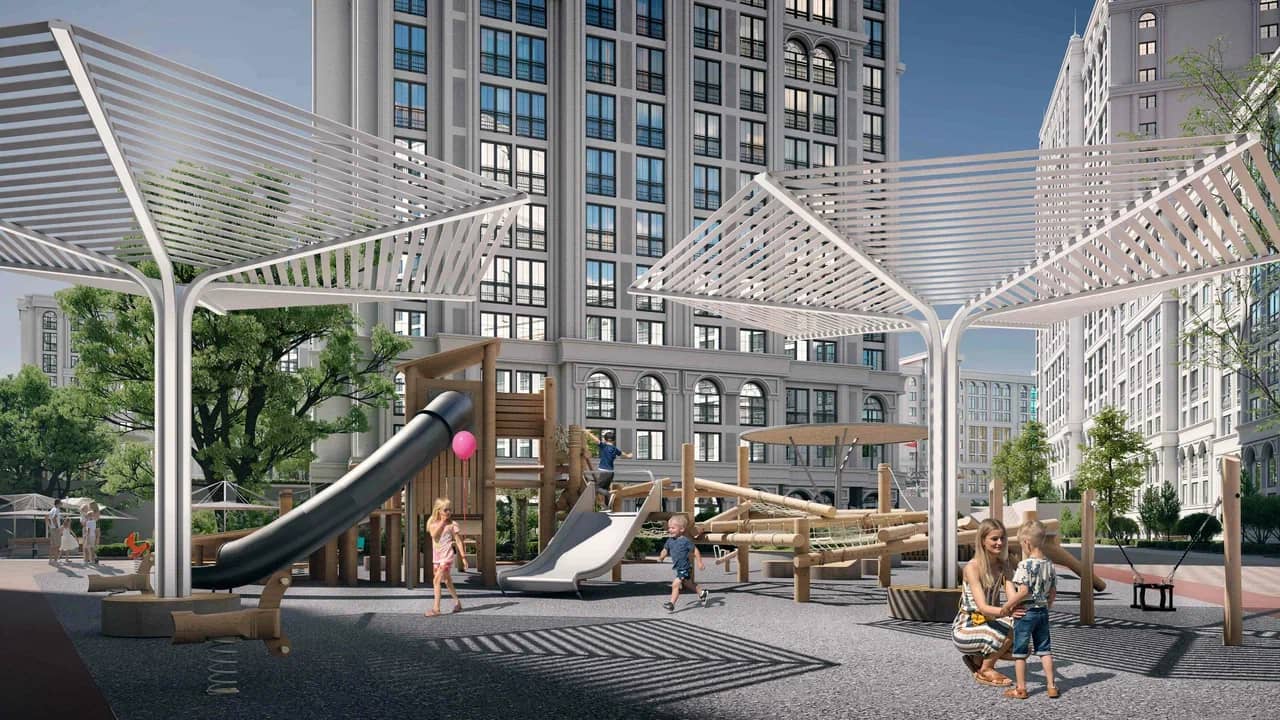 Вдоль прогулочной аллеи будут высажены высокие деревья и цветущие кустарники, а значит для вечерних променадов не понадобится покидать жилой комплекс