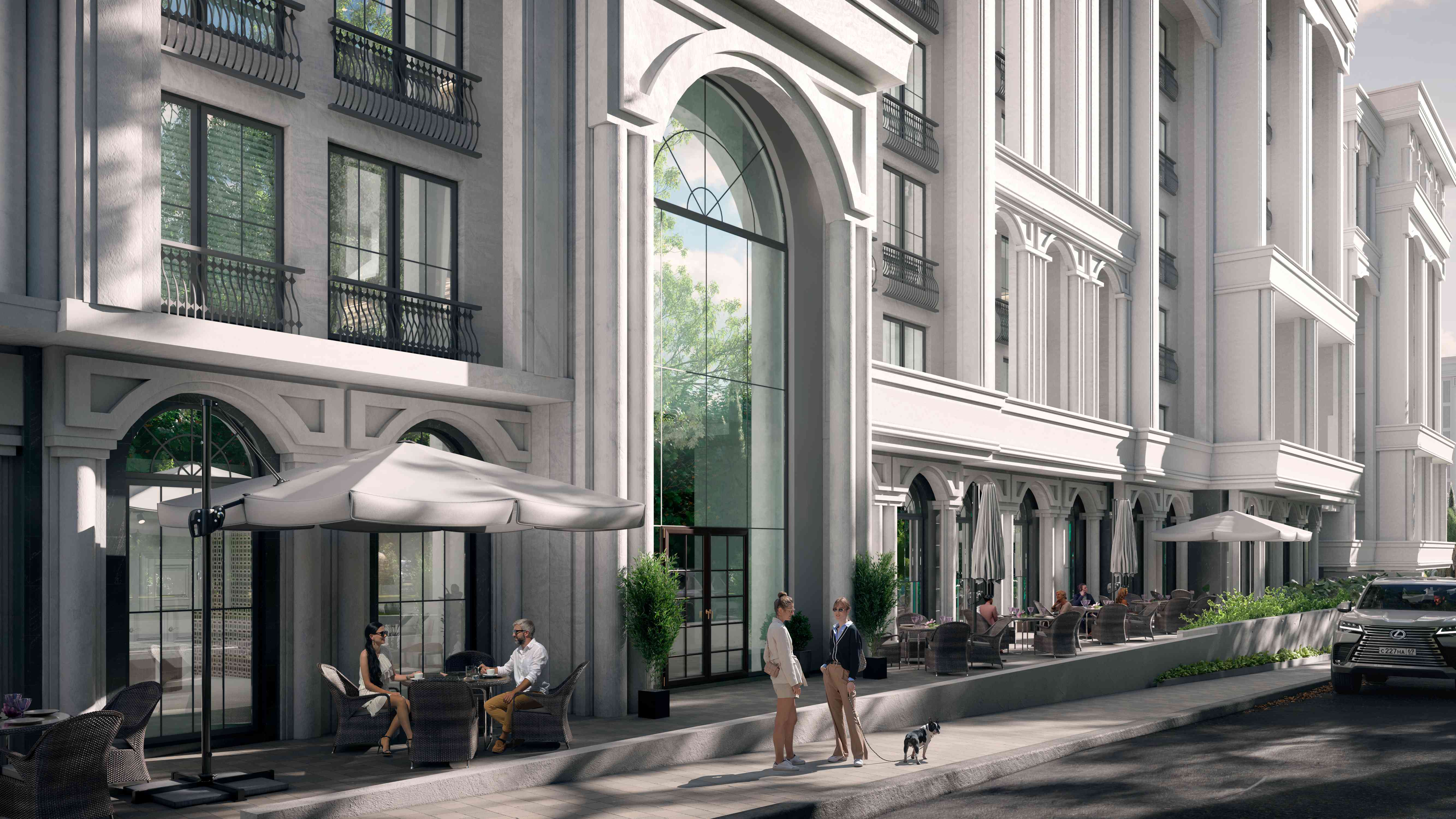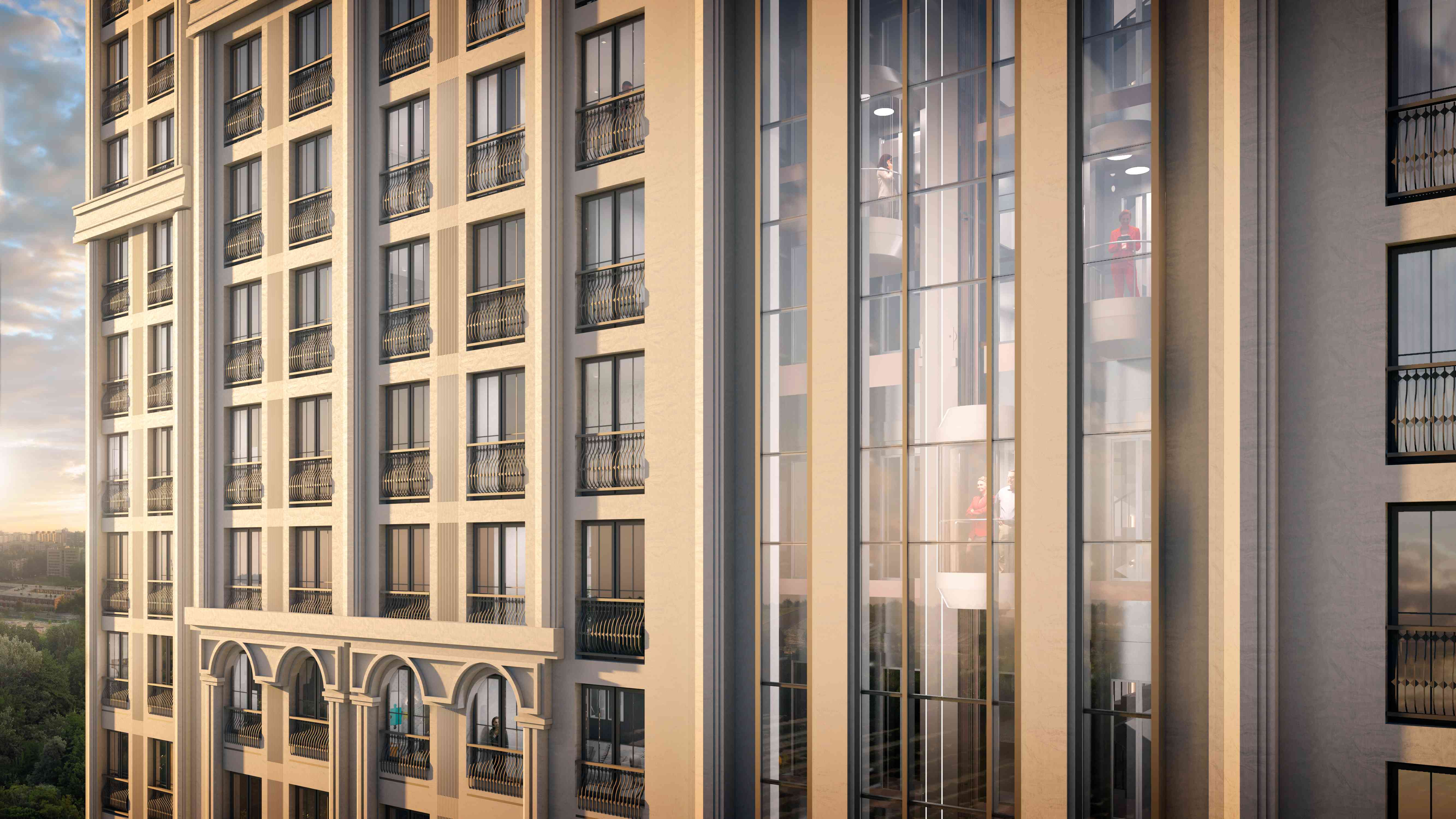 Архитектура фасадов — изюминка комплекса. Утонченный дизайн ЖК будет каждый день радовать взгляд своей изысканностью. Неоклассический стиль и экологичные природные материалы в совокупности с передовыми технологиями строительства позволяют создать комфортный дом премиум-класса.
