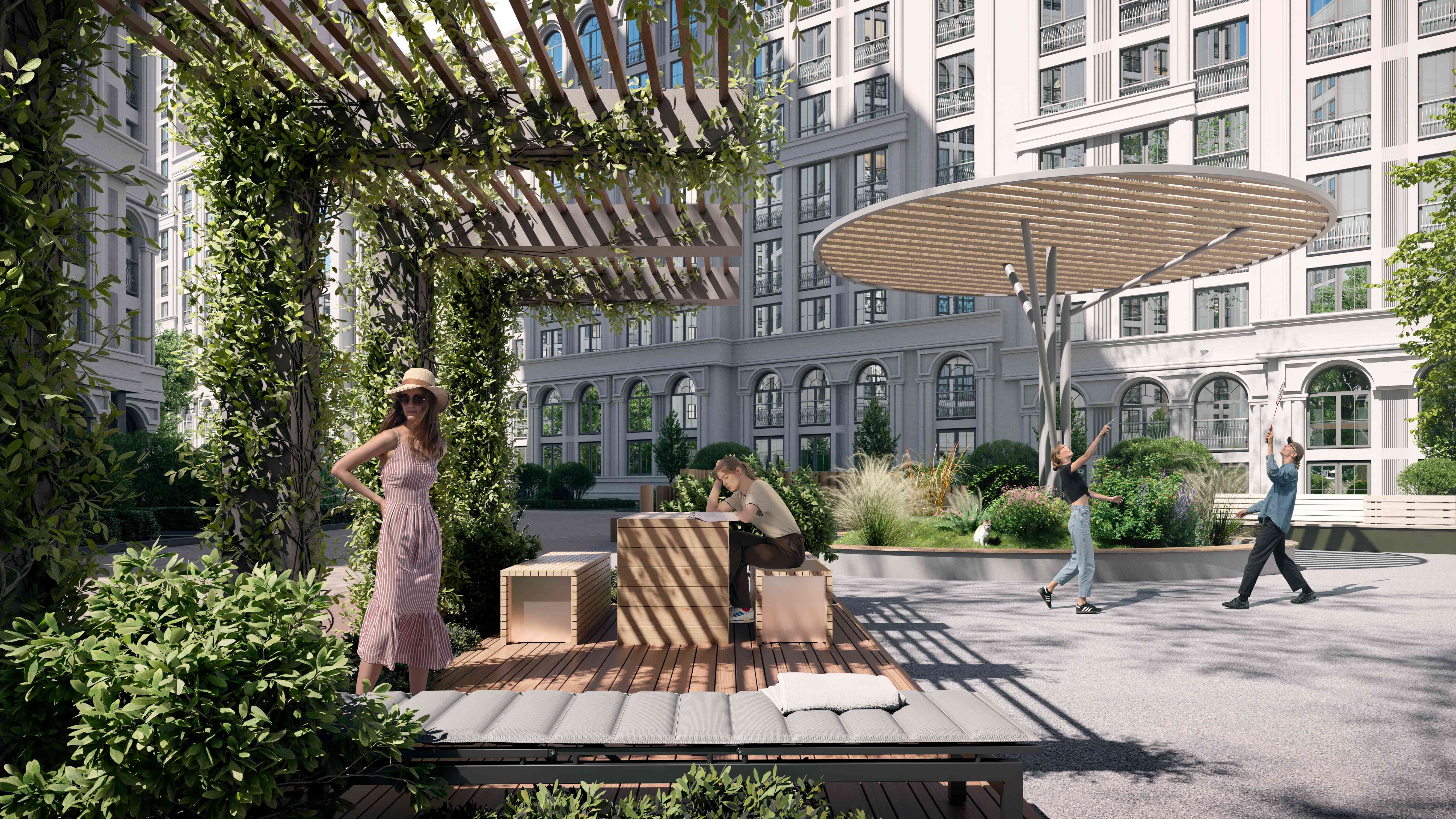 Дизайнерский ландшафт зонирует локации придомовой территории, создавая укрытие от солнца в жаркие дни и насыщая воздух кислородом.